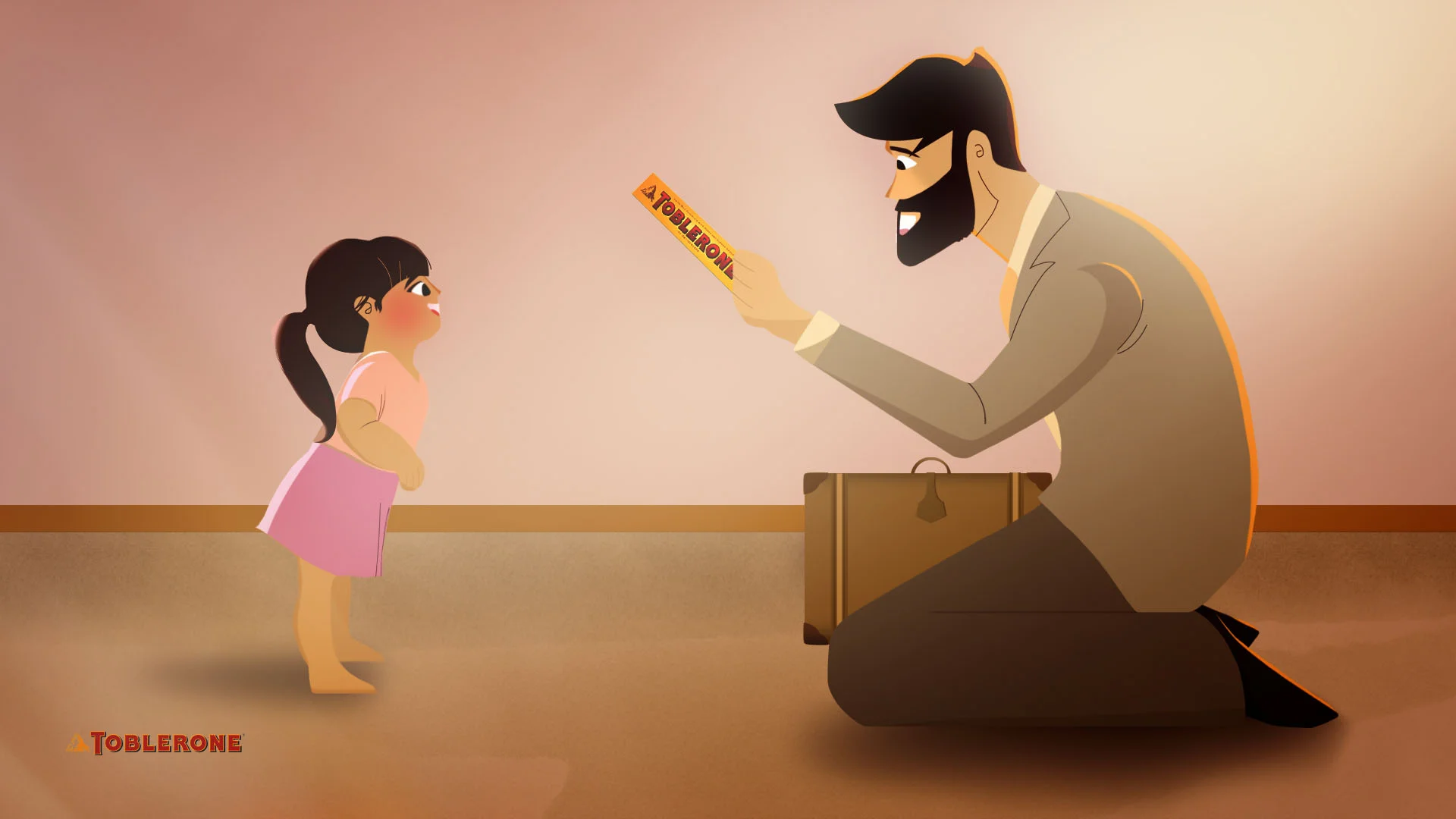 A father coming home from a business trip and giving his daughter a Toblerone chocolate bar.
